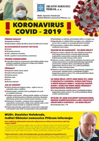 Oblastní nemocnice Příbram vydala informace ke koronaviru. Na informačním letáku najdou občané informace, jak se proti nákaze chránit, co mají dělat, když byli nebo jsou v kontaktu s osobu, která pobývala v místě nákazy, jak je příbramská nemocnice na nákazu koronavirem připravena a mnoho dalšího.